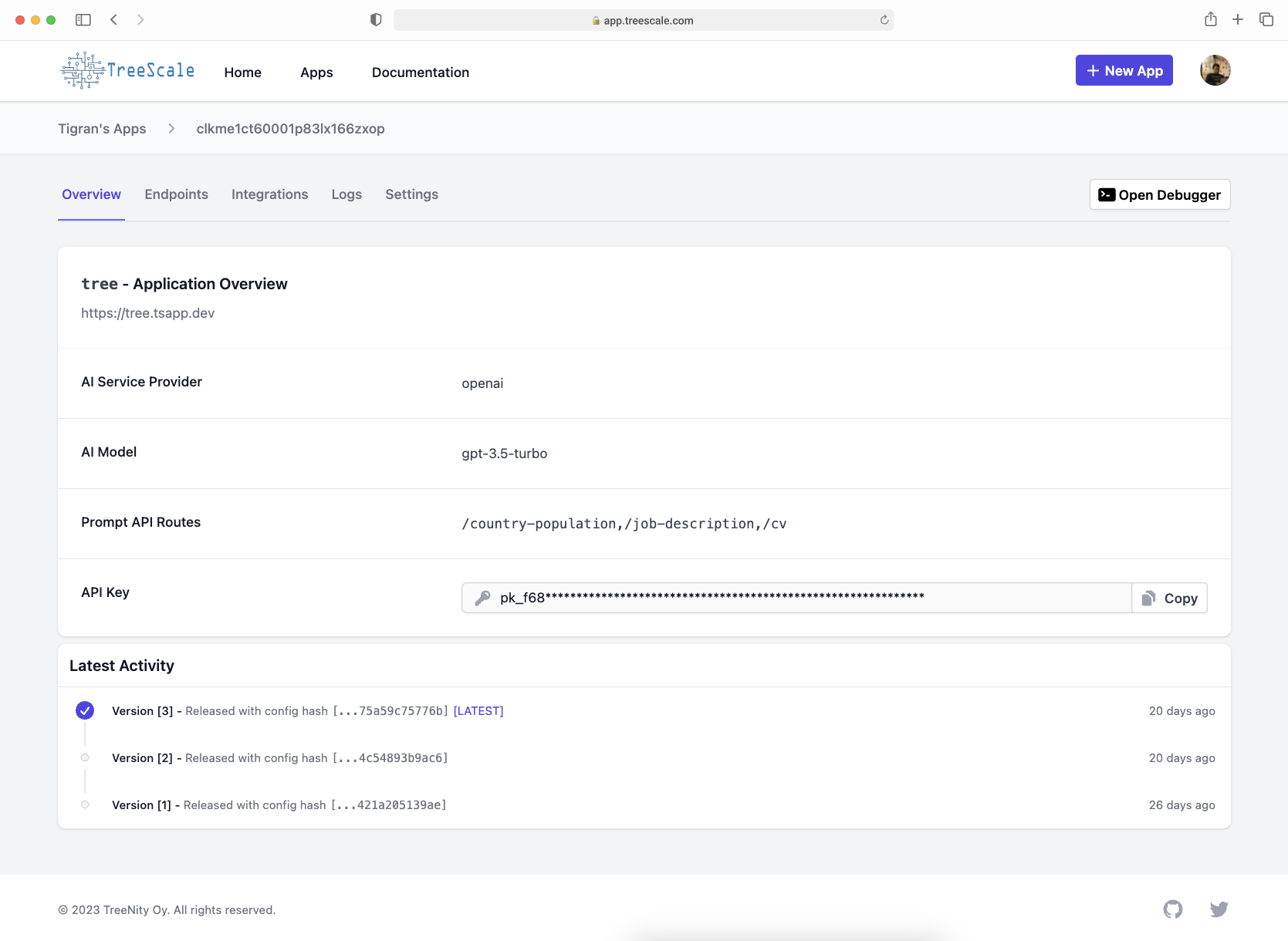TreeScale Platform focuses on delivering the most straightforward way possible to integrate API Endpoints from your LLM Prompts, Prompt Chains, and existing data as an AI Model Context.