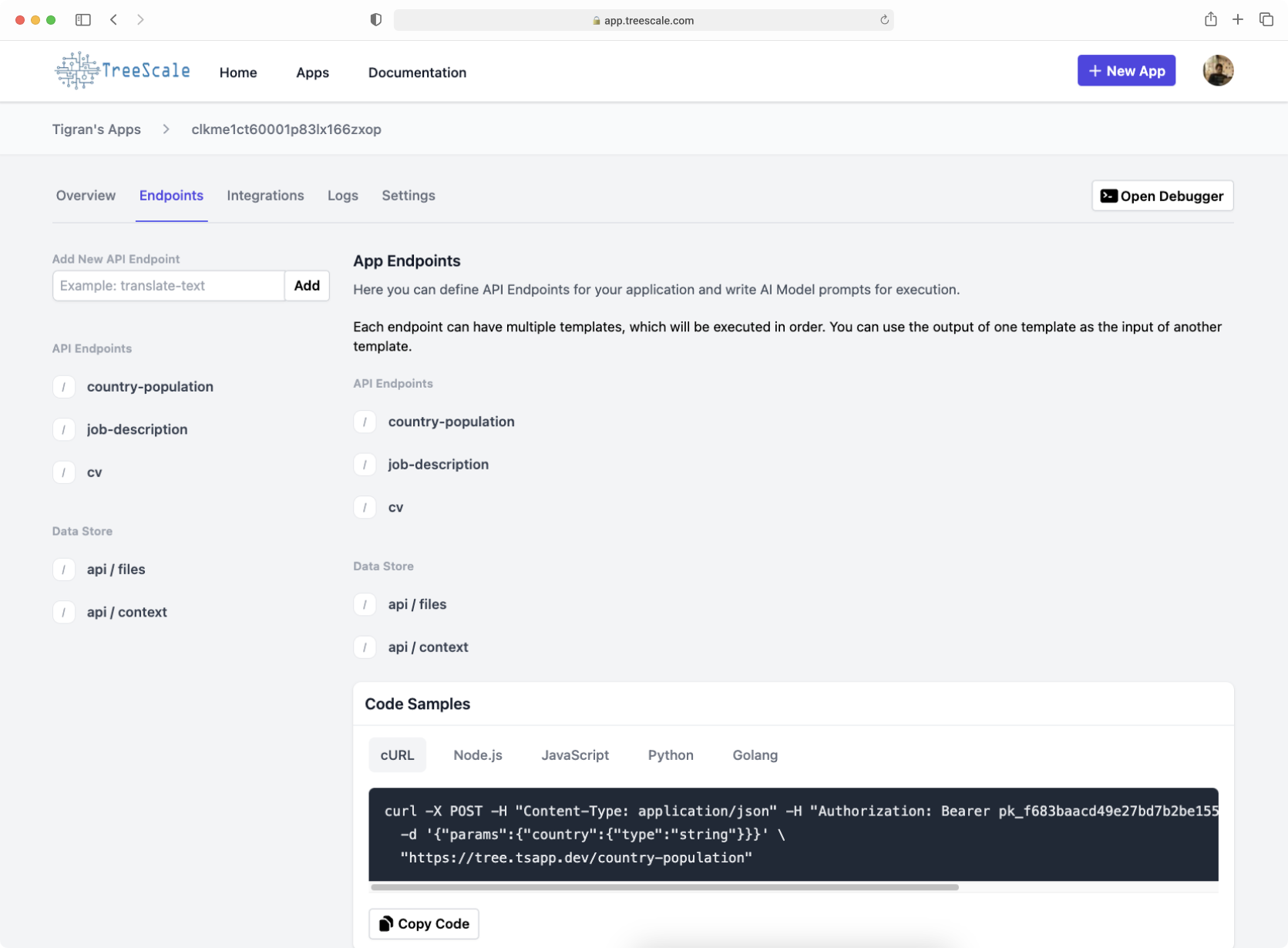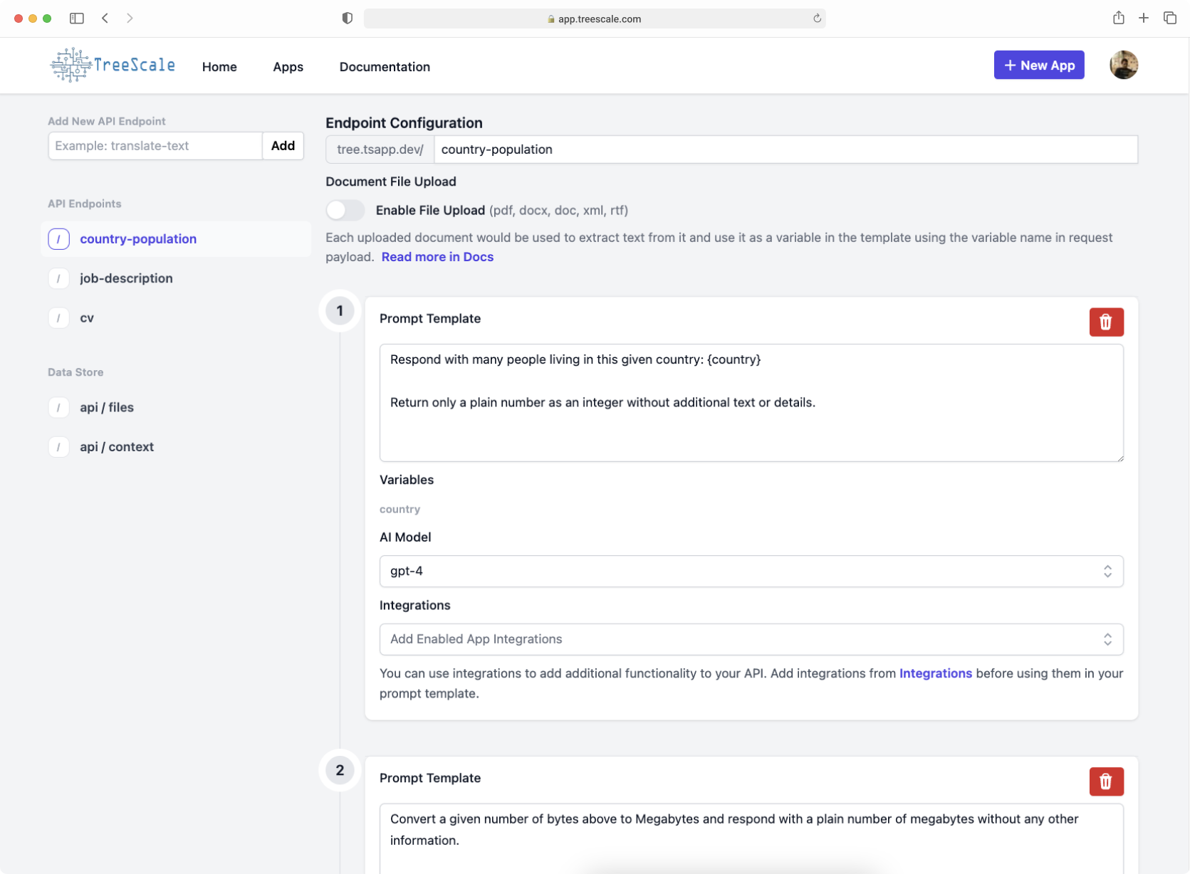 Using TreeScale Platform, you can create integrable API Endpoints from your data and LLM Prompt Chains without writing a single line of code.